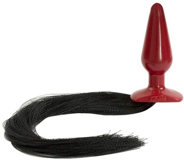 Červený anální kolík s koňským ocasem, který je dlouhý 38 cm. Délka kolíku 14 cm, průměr 2-4 cm. Anální kolík je možné využít v tz. Pony Play ( submisivní osoba je se svým souhlasem uváděna do role zvířete).